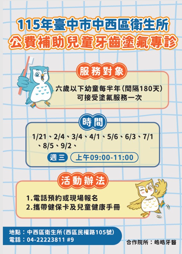 115年臺中市中西區《兒童牙齒塗氟》專診(公費補助)