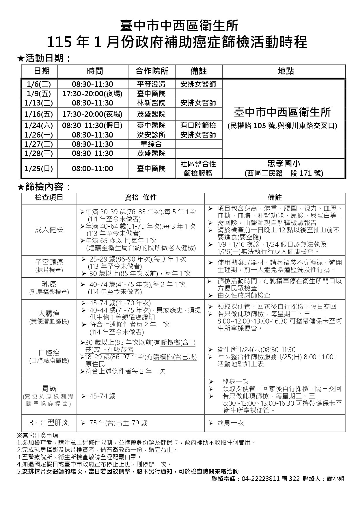 11501健檢活動宣導單-1_page-0001 115年1月份政府補助癌症篩檢服務場次訊息 如附件 提醒您~ 1月份篩檢服務場次如遇臺中市政府宣布停止上班,則停辦一次。 若有其他因故無法辦理之情事,會另行公告於本所網頁,如有任何問題,歡迎來電本所洽詢,謝謝。 ~中西區衛生所關心您~