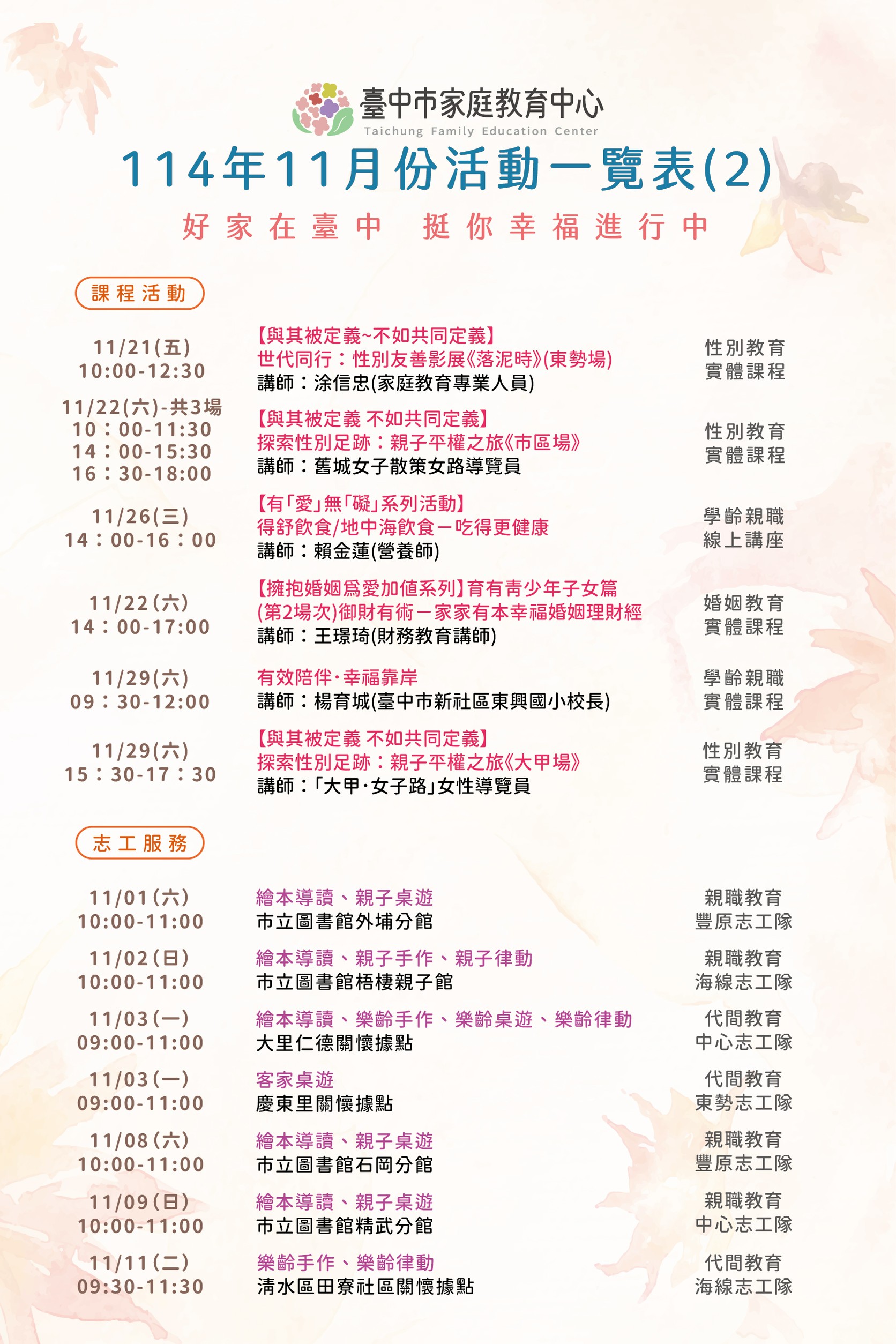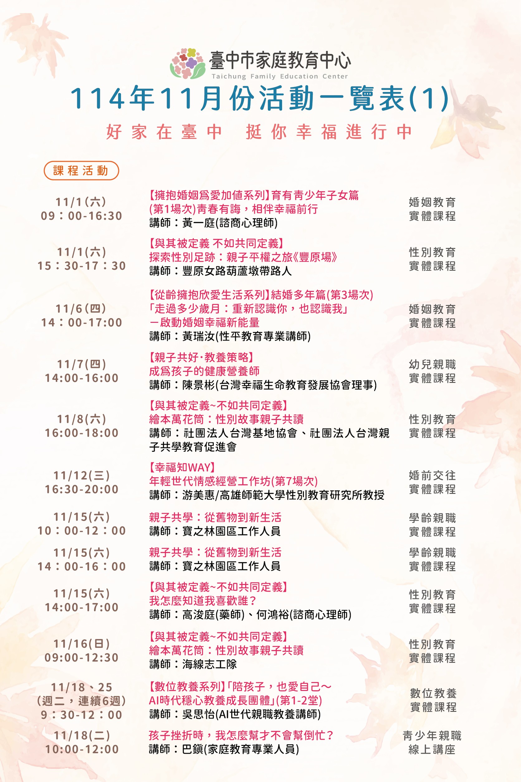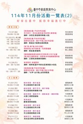 本市家庭教育中心114年11月份活動一覽表,如下。