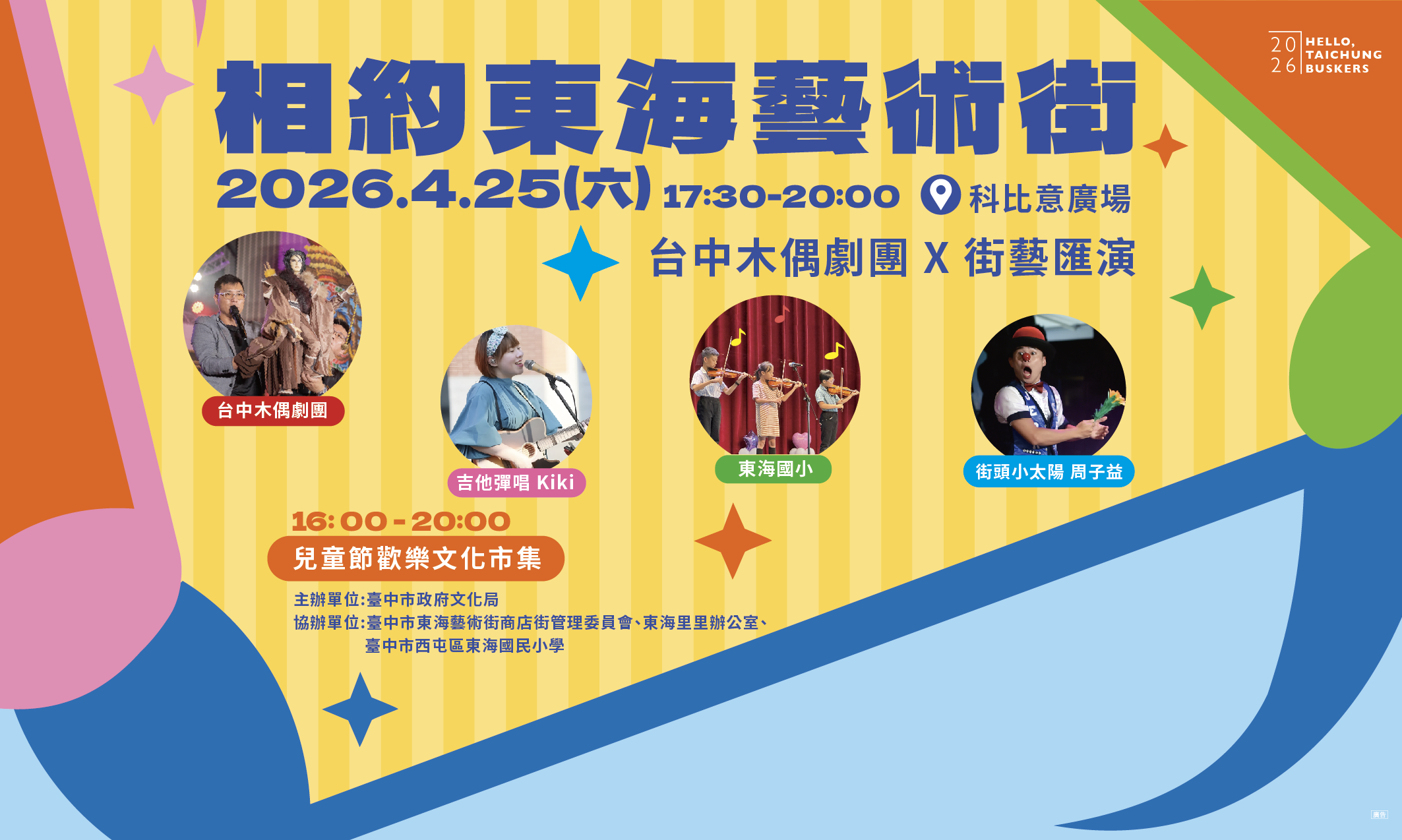 轉知本府文化局將於115年4月25日(六)下午5時30分於東海藝術街「科比意廣場」辦理「相約東海藝術街:台中木偶劇團X街藝匯演」戶外演出活動